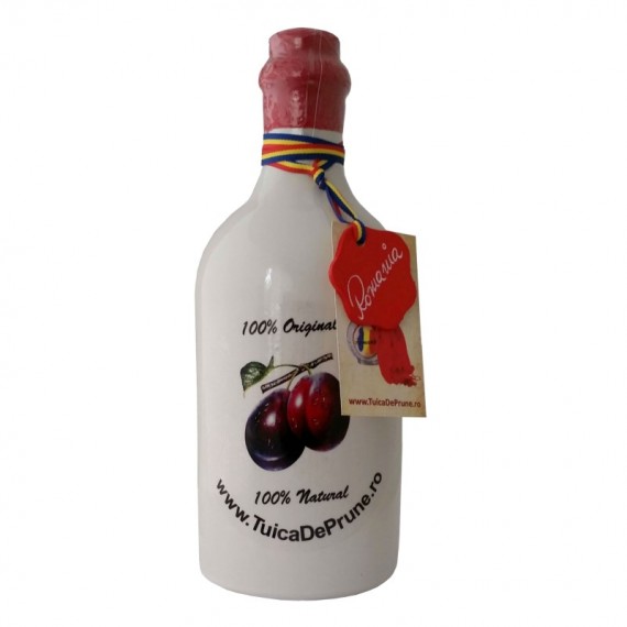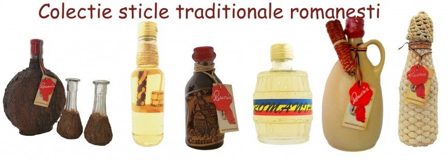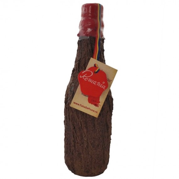 Plosca imbuteliata cu rachiu de fructe, imbracata in scoarta de copac.
