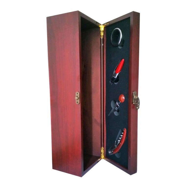 Cutie din lemn furniruit, captusita pentru o sticla de vin cu accesorii ( inel, antipicurator, dop si desfacator).