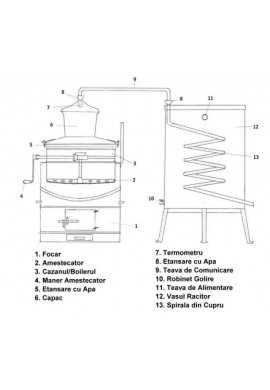 Setul contine: Cazanul de tuica cu amestecator incorporat si Termometru - 60 litri, racitor cu spirala de cupru- 320 litri, teava de legatura si focar pentru lemn.