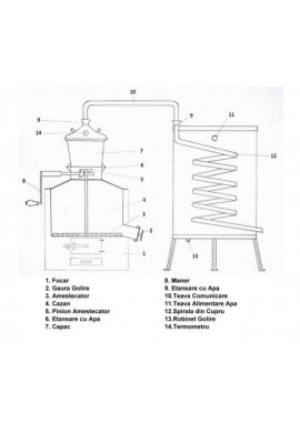 Setul contine: Cazanul de tuica cu amestecator incorporat si termometru - 120 litri, racitor cu spirala de cupru- 320 litri, teava de legatura si focar pentru lemn.