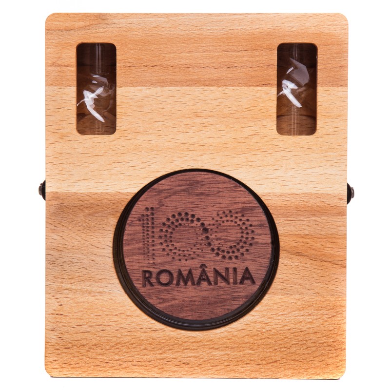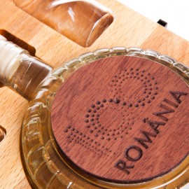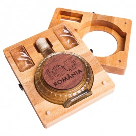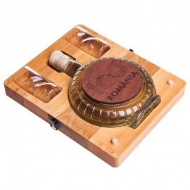 Plosca, imbuteliata cu rachiu de fructe, pastrata intr-o cutie de lemn de lux.