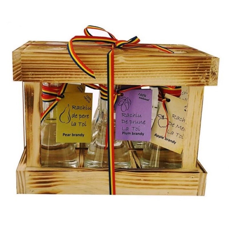 Pachetul contine 6 toiuri imbuteliate 2 cu rachiu de prune, 2 cu rachiu de mere si 2 cu rachiu de para prezentate intr-o caseta din lemn.